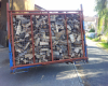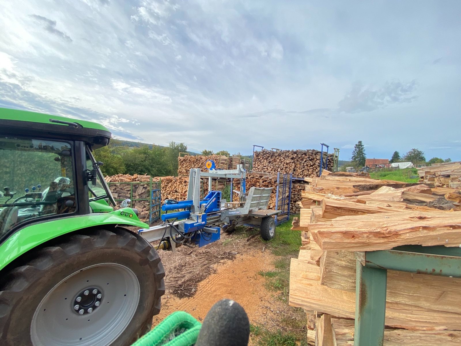 Nach Lagerung werden diese Meterstücke verkauft oder mittels einer Trommelsäge auf ca. 25 cm oder 33 cm langes ofenfertiges Brennholz geschnitten.